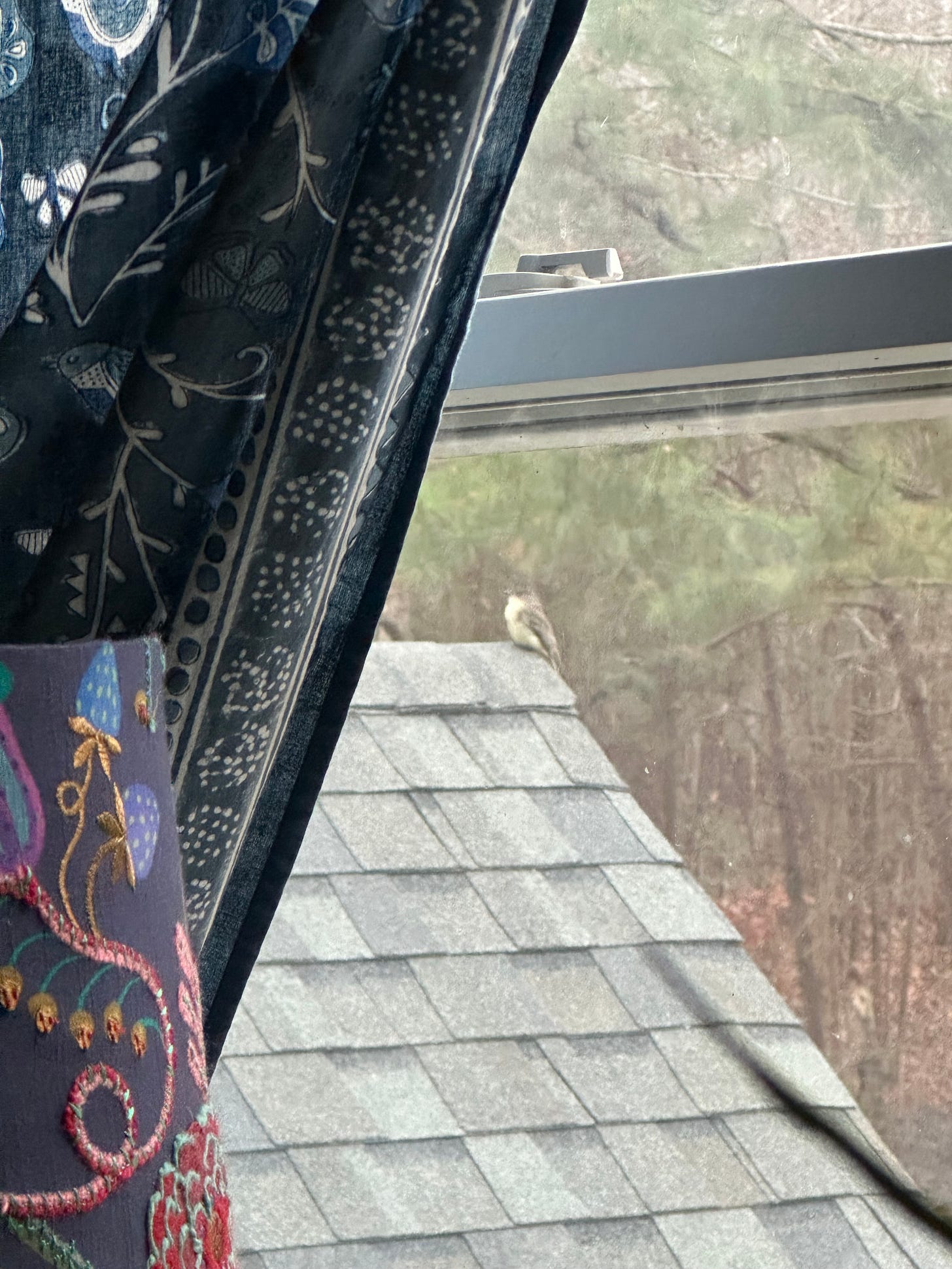 All week and part of last, this little bird sits on the peak of the roof outside my office window. As I see clients, listen and talk and do EMDR sets, he sits there, flies away and returns, grooms himself, and occasionally looks in at me. My daughter says he’s a phoebe. The phoebe symbolizes transformation, rebirth, and renewal. I am completely smitten.