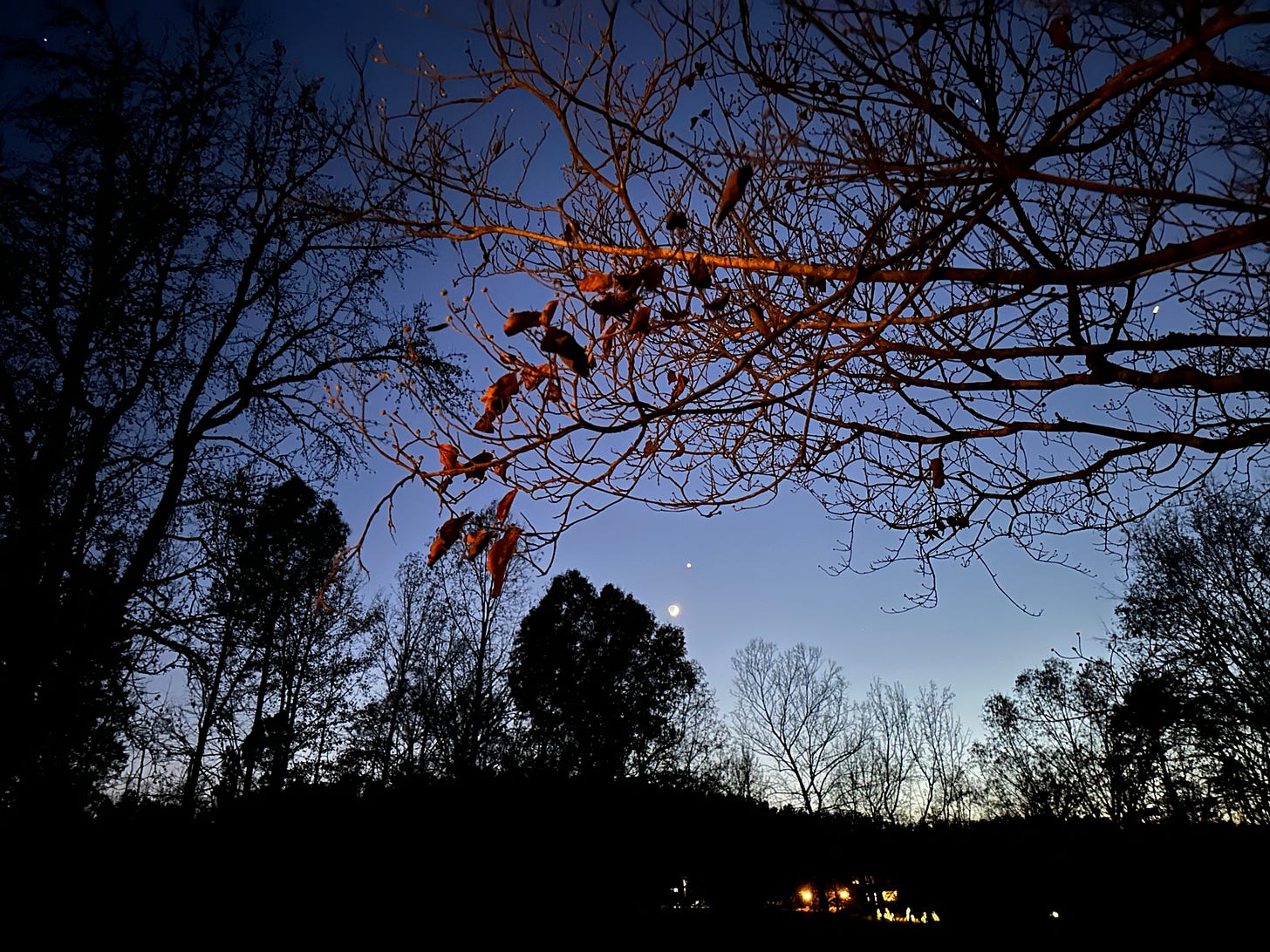 Like Venus and the crescent moon, which almost looks full in this photo. The trees, oh the shapes of trees in winter against winter skies is one of my most favorite things in this world.
