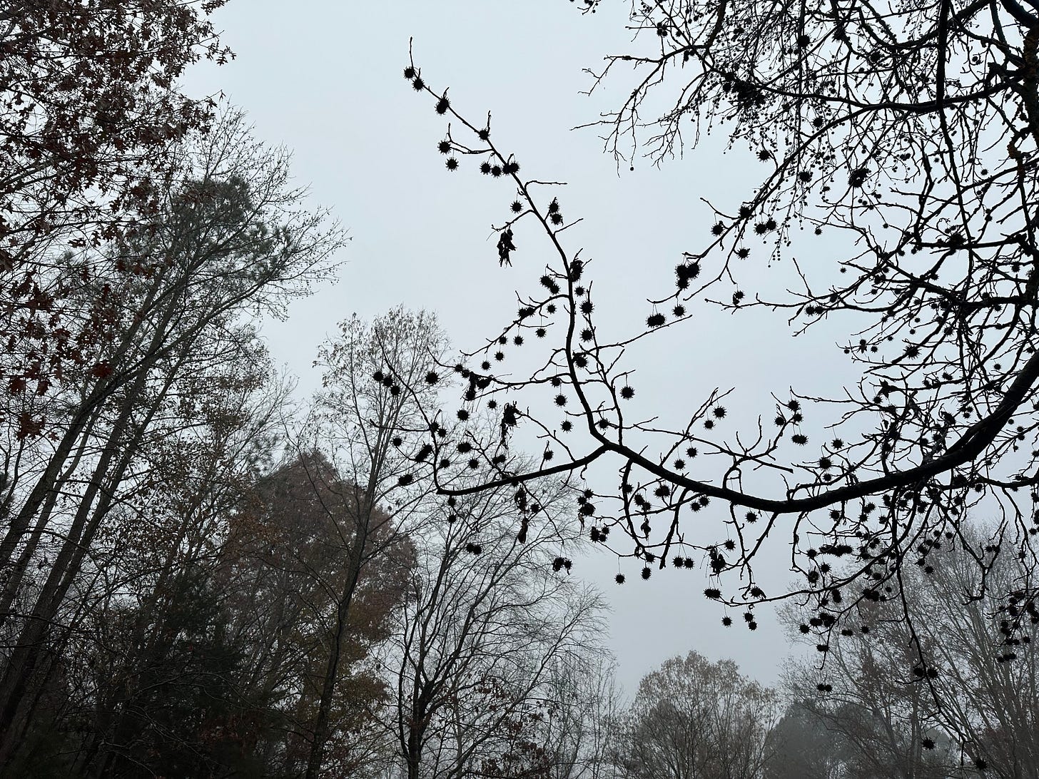 Whenever I walk I look up and I always find something I love up there. This was early today when the fog was thick closer to the ground and the way the crowns of the trees are speaking to one another with that wonderful curve of sweetgum in the foreground caught me up to a high place.