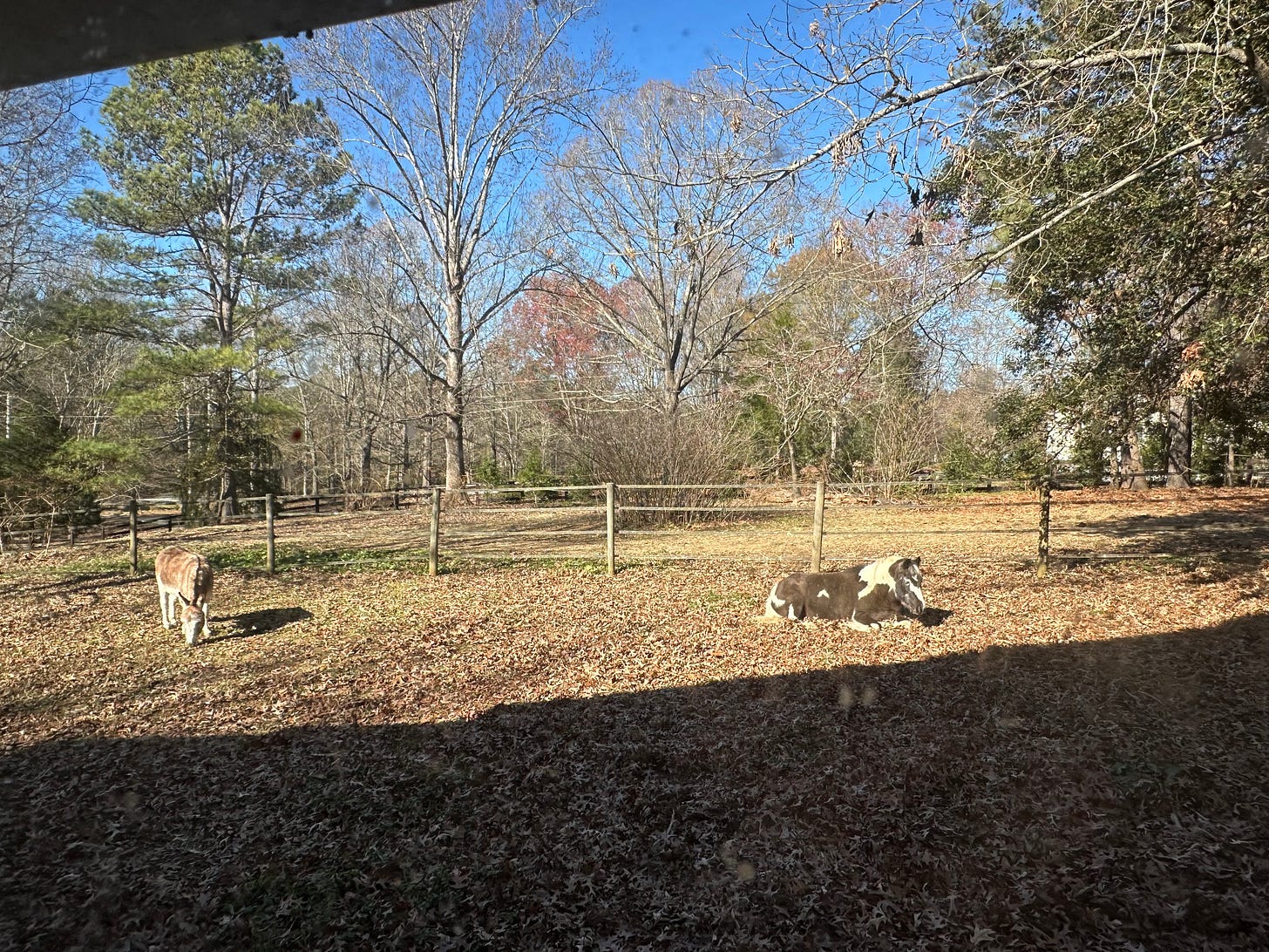 The view out my bedroom window. A winter morning with evergreens, the bones of trees, a blue sky, and two supremely handsome fellows. This is how close they are to me and I love it so much.